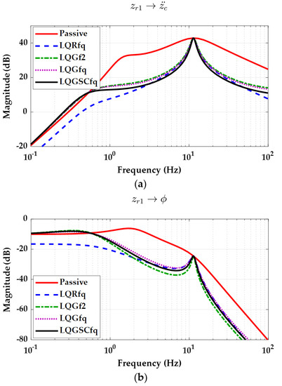 The first type of frequency-domain analysis is done for the full-state feedback controllers. For frequency-domain analysis, the FC model is used. Figure 5 shows the frequency responses of each output from the road profile zr1 with the FC model for each controller. The gain matrices of Kq and Sq of LQRq and LQSCfq are given in Table 4. LQRq was obtained by solving Riccati equation with the state-space Equation (9), the LQ objective function (10) and Table 2. LQSCfq was obtained by solving (51) with the state-space Equation (31), LQ objective function (36) and Table 2. As expected in the Section 2.3, LQRfq and LQSCfq has nearly identical elements as given in Table 4.
