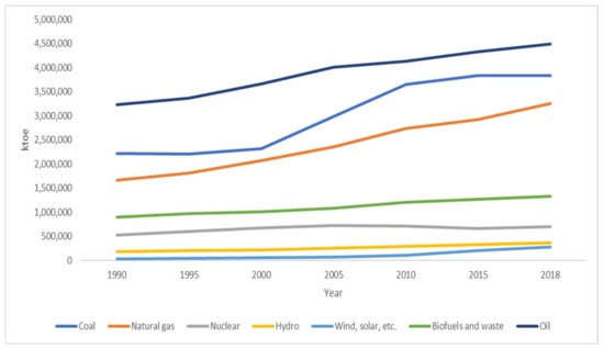 Total energy supply by source in the world (1990–2018). Source: own results based on [24].