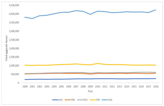Total electricity generation in selected OECD countries (2000–2018). Source: own results based on [71].