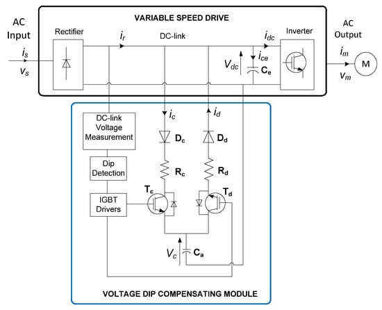 Electricity supply in developing economies is characterized by low generation and dominated by frequent faults and outages owing to lack of financial resources, old infrastructure and poor maintenance [1,2,3]. Voltage dip sensitive equipment including variable speed drives (VSD) are negatively affected by such frequent faults and outages leading to voltage dip-related trips. This results in disruptions of critical processes, loss of production and revenue [4]. Various transmission grid codes have a common way of defining which grid disturbances have to be tolerated. They also specify frequency of occurrence of these disturbances. VSDs are used to drive critical processes in power generation equipment and they are required to be able to ride-through a 0.2 s short-term power interruption (STPI) [5,6]. Studies carried out by numerous researchers to analyse the behaviour of a VSD during a voltage dip, have identified the dc-link under voltage as the main reason for the VSD tripping during a voltage dip [7,8,9]. There is an abundant number of VSDs on the market of different makes and models which gives rise to differences in susceptibility and response to voltage dips and STPI [9]. Existing VSD topologies can be modified to enhance their ride-through capability. Most modifications to existing topologies would require close collaboration with different manufacturers to access design base technical information. Such arrangements present challenges due to intellectual property which is closely guarded by manufacturers and thus not readily available for access by users of VSDs. Modifications to the drives must then be limited to an electrical connection only between the existing VSDs and ride-through enhancing module. This results in limited options available for enhancing ride-through capability for existing VSDs.