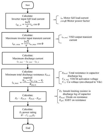 A sizing methodology based on readily available data such as the motor and VSD name plate information is developed. Figure 4, Figure 5 and Figure 6 show the proposed sizing methodologies for inrush current limiting resistors Rd, Rc and capacitor Ca. For Figure 4, this algorithm works backwards from motor size to the dc link of the VSD or inverter. The motor full load current and the motor power factor can be obtained from the motor name plate. These values will then be used to calculate the input inverter dc current (idc_n). The inverter output transient current or peak current can be obtained from the inverter nameplate. Once this is obtained the inverter peak dc bus current can be calculated (idc_max). Then this will allow for the maximum discharge current to be calculated (id_max). Since id_max will be calculated, and given a set voltage where compensation should start (Vdc_trig), diode forward voltage (Vf) and the capacitor voltage (Vca), it then becomes possible to calculate the total resistance in the capacitor discharge leg. Given the knowledge of the IGBT internal resistance and that of the diode, the current limiting resistor can then be calculated (Rd) including its power rating. Figure 4 shows the analytical progress of obtaining the size of the current limiting resistor when switching the additional capacitor onto the dc bus.