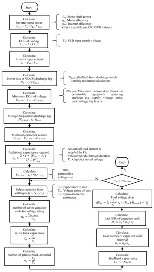 Figure 5 shows the additional switched capacitor sizing. Given the motor shaft power, motor efficiency and inverter efficiency from their nameplates the inverter input power can be calculated. The additional capacitor is calculated based on the assumption that full load current would be produced by this capacitor. This is because the additional capacitor will be used to supply the full load during a STPI. Given the known capacitance (from calculations) and the dc bus voltage, the appropriate capacitor can be chosen from the started capacitor units. Once the equivalent series resistor is calculated, the expected voltage drop on the dc bus can be calculated based on the chosen capacitor. If the voltage drop calculated is smaller than the set desired voltage drop (Vdc_max) then the loop ends. This will mean that the chosen standard capacitor will satisfy the conditions to not drop the dc bus voltage beyond (Vdc_max) during a STPI.
