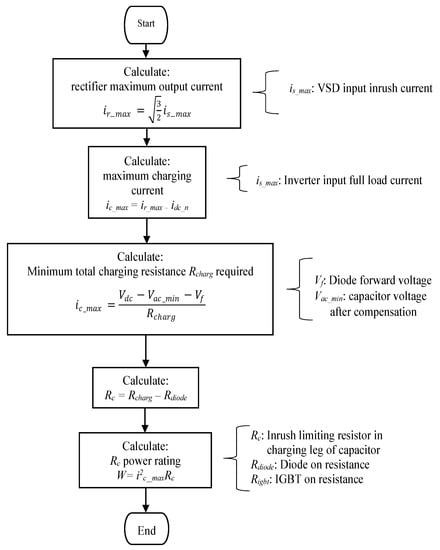 In Figure 6, a charging limiting resistor is calculated. Having obtained the VSD input inrush current by calculations. The rectifier maximum output current can be calculated. Once the minimum charging resistance is obtained, the inrush charging limiting resistor can be calculated including its power rating. It should be noted that during the charging scenario, the additional capacitor voltage would be minimal.