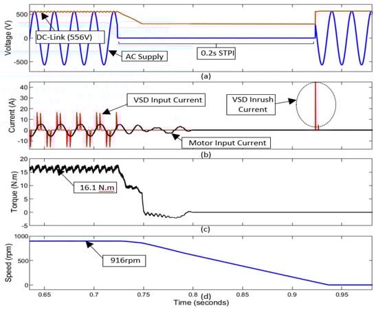 When a 0.2 s STPI was simulated on the VSD supply, the dc-link voltage started decaying at a constant rate from an initial value of 556 V whereas the dc-link capacitor of the VSD supplied all the power required by the motor as shown in Figure 7. There was a gradual reduction in speed and torque as the dc-link voltage decayed. The dc-link voltage continued to drop until 300 V which is the under-voltage trip setting at which stage the VSD tripped. This is indicated by the flattening of the dc-link voltage curve and a loss in motor torque. There was an increase in the rate of speed reduction as load torque decelerated the motor-drive rotating assembly. After VSD tripped, for a brief period, the motor switched to an induction generator as the load acted as the prime over and stator windings acted as a current source allowing self-excitation of the motor. Once stator current decayed to zero, developed torque decays to zero. After the STPI was cleared over a period of 0.2 s, there is a sudden buildup of inrush current as shown in Figure 7. This results from low resistance of the VSD capacitor which is now experiencing a sudden high voltage after the STPI.