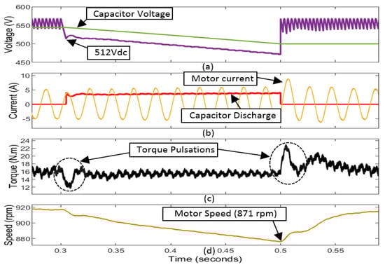 There was a decrease in the dc-link voltage when the supply was lost. At the point where the dc-link voltage dropped below the trigger set point voltage of 512 V, the dc-link voltage compensating device was initiated. The additional capacitor bank was switched onto the dc link and started supplying additional power. This is evidenced by the sudden halt in the “dc-link voltage” rate of decay and an increase in the dc-link voltage from 512 V to 524 V. The halting of the “dc-link voltage” decay was accompanied by a sudden increase of the current from the additional capacitor since the capacitor started to inject power into the dc-link i.e., delivering power to the motor as shown in Figure 8. Table 2 shows the summary of the simulation results.
