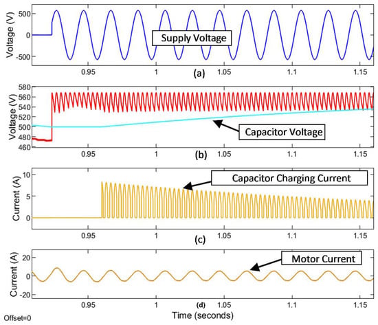Simulation results for dc-link charging of capacitor Ca, (a) supply voltage, dc-link and (b) capacitor voltage, (c) capacitor charging current and (d) motor input current.