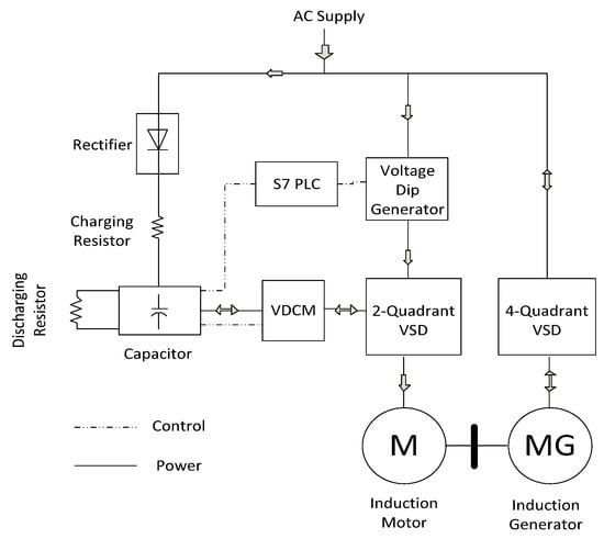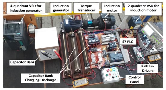 The motor speed and torque were measured by a torque transducer mounted between the motor and generator coupling. The torque transducer had a maximum error of 0.25%. The voltage transducers and the current transducers each had a maximum total error of +/−1%. Before the capacitor was put on standby for dc-link compensation, charging was carried out through a separately powered bridge rectifier as shown in Figure 12.
