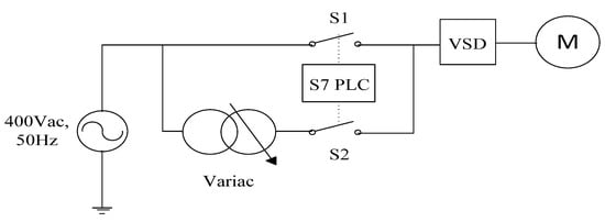 A variac transformer was used for the voltage dip generator on the dc bus of the 2 quadrant VSD. The variac allowed for any dc bus dip voltage needed to be achieved. Figure 11 shows the diagram of the voltage dip generator. When switch S1 is on S2 is open, the variac would be set to a lower supply voltage in order to emulate a fault on the supply and by switching on S2 for a particular period a voltage dip can be created on the dc bus of the VSD. Figure 12 shows the experimental set-up.