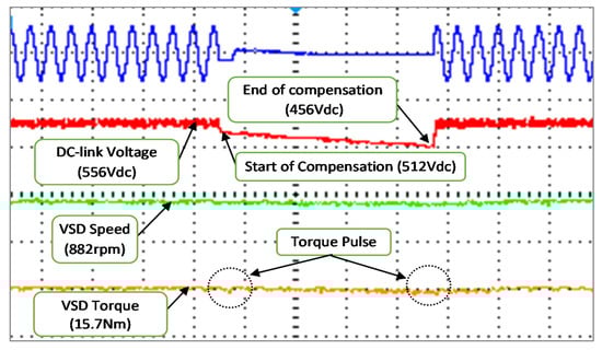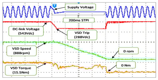 Figure 13 shows the results obtained when the two-quadrant VSD is subjected to a 0.2 s STPI. Once supply to the VSD was lost, the dc-link voltage immediately started decaying as the VSD dc-link capacitor supplied all the required motor power. The VSD tripped once the dc-link voltage had dropped to below the low dc-link trip setting of 288 V. This is indicated by the flattening of the dc-link voltage curve. Once supply was restored at the end of the dip, the dc-link voltage rapidly increased to its nominal level with some initial oscillations. The voltage dip clearance was followed by a current spike as the VSD dc-link capacitor started charging up.