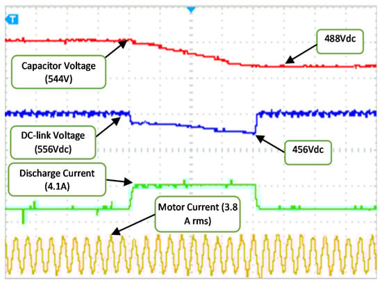 The dc bus was operated at 556 V and the compensation capacitor was pre-charged to a voltage of 544 V as shown in Figure 14 and Figure 15, respectively. During a fault the dc bus voltage started to drop. Once the voltage drops below 512 V, the trigger circuit was activated which then effectively switched the additional capacitor bank onto the “dc-link”. Slight reductions in shaft speed including insignificant motor torque pulsations during the STPI were observed as shown in Figure 14. Figure 15 shows the instant increase of the discharge current from the additional capacitor drawn into the dc bus.