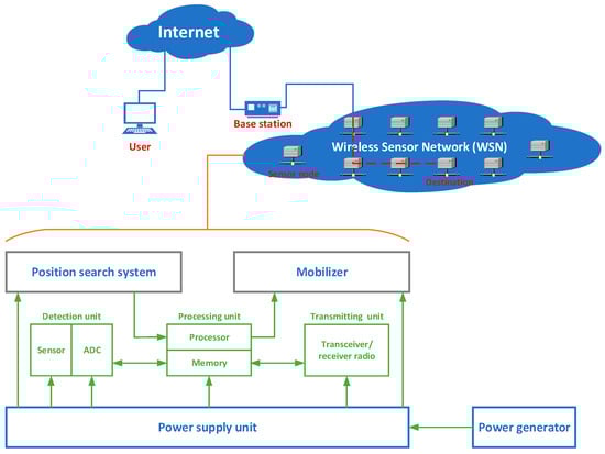 Figure 1 is a general scenario showing the service-oriented architecture of the IoT for which the research is being carried out in the WSN subsystem, which is a common component of the network and sensing layers. A schematic of a typical WSN structure along with a sensor node diagram is shown in