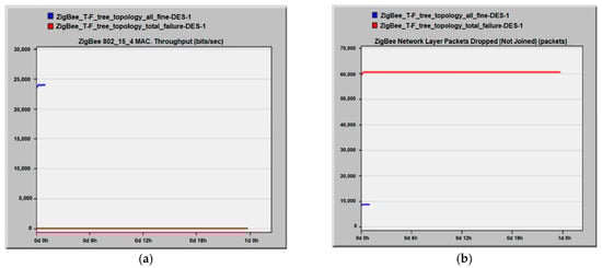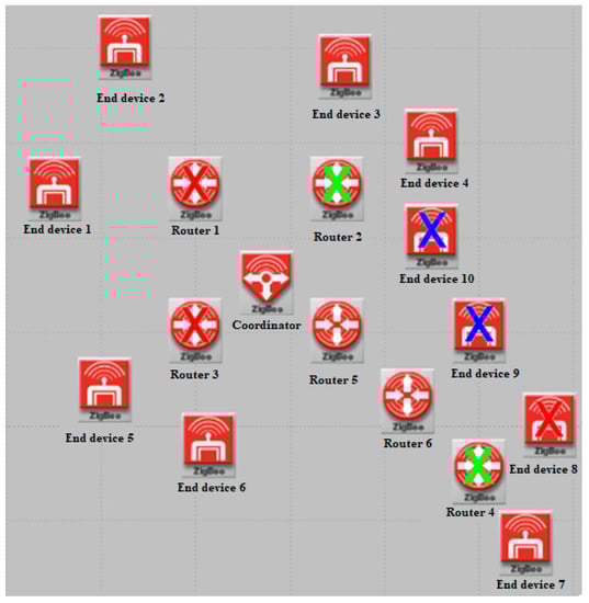 This research aimed to test the resilience of the network against data communication threats such as node failures. For this purpose, a network topology was created that included one coordinator, several routers, and end devices. Several scenarios were then simulated in which different devices were intentionally damaged. The first scenario with all devices working served as a baseline for the other three. The devices have a limited range, so they were deployed in such a way that they could communicate with each other without hindrance. The second scenario assumes the failure of a few devices, which should not disrupt the network to a significant degree. The failed nodes are marked with a green X. In the third scenario, more devices fail, which should translate into less efficient network operation. The failed nodes were marked with a blue X. The fourth scenario assumes that many devices fail, paralyzing the network operation. Both end devices and routers fail. This should prevent communication between devices, especially with the coordinator, and consequently paralyze the network. The failed nodes are marked with a red X. The topology of the analyzed network and scenarios along with the designation of the damaged nodes is shown in