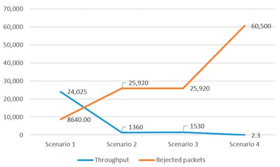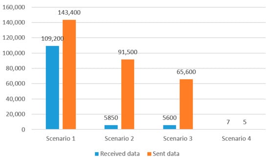 Figure 11 shows that as the number of disconnected nodes increases, the values also decrease until the network is completely disabled. It can be seen that the number of received data decreases systematically with the number of disconnected nodes (from 190,200 b/s—Scenario I, to 7 b/s—Scenario IV). The situation is similar for the number of packets sent. The number of data sent decreases from 143,400 b/s—Scenario I, to 4–5 b/s—Scenario IV).