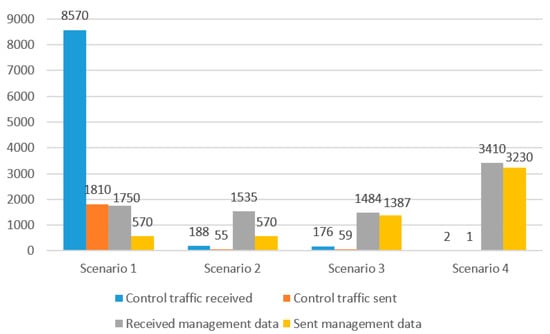 In the fourth scenario, the amount of network management data is huge, several times higher than the previous scenarios. Also, the number of discarded packets is very large and is as high as 60,500 packets. The detailed traffic comparison is shown in