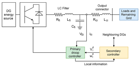 One of the promising solutions to the above problems can be secondary voltage control through the coordination of available QU-droop control-based regulators. A new approach to integrating CIGs into distribution grids and micro-grids suggests harmonized voltage control using inverters, through which solar and/or wind generation is connected to the grid and which are located at the end users. In the context of considerable DER-based generation and a plunge in consumption from the grid, voltage stabilization and loss reduction are provided by remotely controlled inverters standing “behind the meter”. Various flexibility services related to active power P and reactive power Q from CIG units can be provided by different modes of primary control of the inverter, through which different types of DERs are connected [12]. More specifically (Figure 2), the primary controller of each DG i, i = 1, …, N registers reference voltages, , from the secondary controller and regulates output voltage to the required setting, which is usually achieved using reactive droop control (Q/V strategy) methods without data exchange between CIGs [13,14].