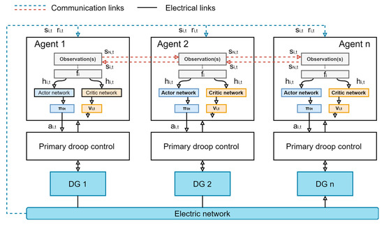 Hidden state received from (5) is then used in actor-critic networks to generate random actions and predict value functions, respectively, i.e., and (Figure 3). We use a centralized training scheme with decentralized execution [34,35], where each agent has its actor-critic networks, and their policy is updated independently but not based on consensus [36] that can reduce the convergence rate of the solution.