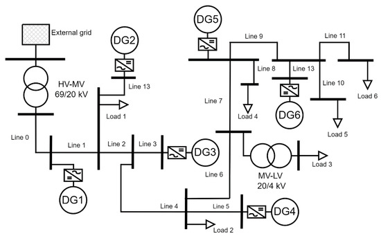 The MARL approach is implemented in the Python environment using open-source tools for power system modeling (pandapower and PowerNet). The simulation platform used is based on the technical characteristics of line and load described in [35,38]. Simulation of heavy load conditions involved random load changes added throughout the network with deviations of ±20% from the nominal values and random disturbances in the range of ±5% for each load. All CIGs in the considered schemes were monitored with a sampling time of 0.05 s, and each CIG could communicate with its neighbors across local boundaries of communication. The primary control of the lower level is implemented by an analogy with [32].