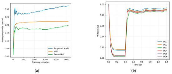 Performance trained MARL policy under 25% load disturbance: (a) MARL training curves for IEEE 34-bus feeder system. The lines show the average reward per training episode, which is smoothed over the past 100 episodes; (b) performance of voltage control.