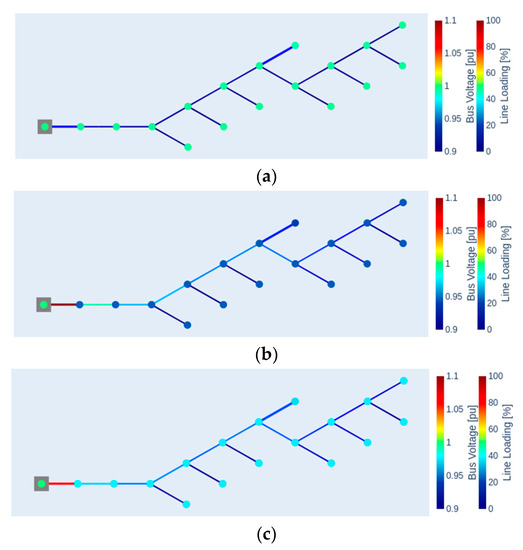 Additionally, the effects of decentralized voltage control are demonstrated by representing the results of operating parameters calculation on the IEEE 34-bus feeder graph for various experimental cases (Figure 6). Comparison of Figure 6b,c indicates that the secondary QU control not only stabilizes voltage at nodes but also reduces overcurrent in system lines. For example, under heavy load conditions, the overloads in Line 0 and Line 1 are 122.68% and 44.36%, respectively (Figure 6b). Secondary QU control leads to a decrease in the current overload in these lines to 91.08% and 32.83% (Figure 6c), respectively.