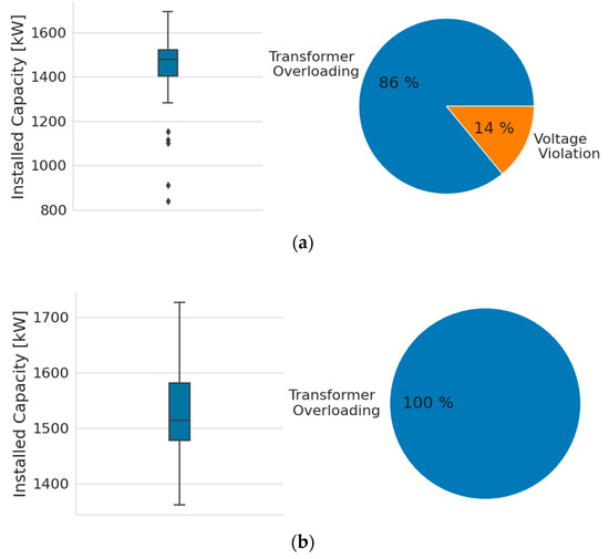 The results for the scenario without voltage control show that the hosting capacity of the IEEE 34-bus feeder ranges from 12.8 MW to 17.6 MW overall (Figure 7a). We can also note that for 50% of the runs it is between 14.1 and 15.3 MW (the median equal 4.8 MW of additional PV capacity). The results also show that the potential problems due to connection of additional PV plants arise due overloading of a transformer (in 86% of cases), and a violation of the voltage band (in 14% of the cases). In the scenario when we have a voltage droop control, the hosting capacity ranges from 13.3 MW to 17.9 MW overall, and the median is increased to about 15.3 MW (Figure 7b). As result, the figure shows that with intelligent MARL-control of inverters, the hosting capacity of the considered electrical network increases from H = 14.6 MW to H = 15.7 MW. The box plot showing the resulting distribution helps to understand the behavior of the network when more PV systems are installed. It shows the minimum, maximum, and average number of additionally installed PV systems that are the first to expect violations. As a result, with intelligent control of inverters, these potential violations (when the maximum hosting capacity is exceeded) are reduced only to an overload of transformers (which we do not control), but voltage violations was eliminated (Figure 7b).