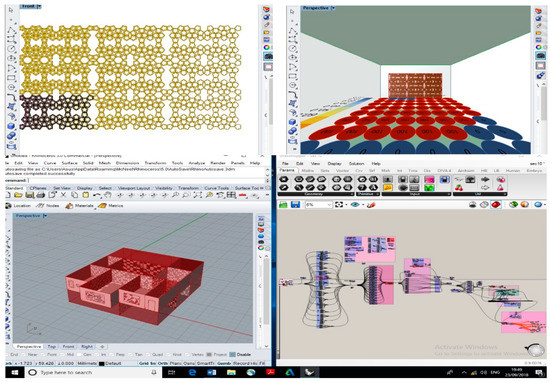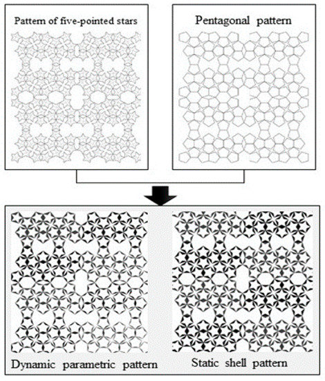 On the other hand, the source of inspiration for designing a shading device in this project was one of the ornamental elements in the historic architecture of Iran. Muqarnas (used ornaments), indeed, is one of the most sophisticated ornaments, which has been considered a symbol of Islamic architecture [35]. Muqarnas originally belongs to the early 10th century, and they have changed to a great extent over time in terms of their design and construction methods in different geographical areas, from East Asia to Spain and West Africa [36]. It is considered a complex element for decoration that initially aims to create 3D facades involving shadow and light by using unparalleled lines and to develop more surfaces to apply more micro decorations [37]. Although there are four different types of muqarnas based on 3D geometry and 2D pattern plan [38], in their geometric patterns, the existence of a five-pointed star and pentagonal shape is common [39]. Used to respond to the required light in space, the five-pointed star and pentagonal shape have formed dynamic and fixed shading devices, respectively, through an accurate parametric modeling process in grasshopper coupled with Rhinoceros 3D software (Figure 1).