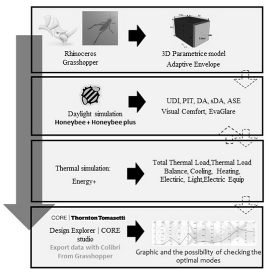 Thus, this research tries to address the challenge of designing an optimal window for office spaces by which the rate of energy consumption would be low and the rate of occupants’ visual comfort would be high. However, this paper goes further to fulfill this gap by analyzing the results of the multi-objective evaluation and developing a computerized model of responsive envelope based on visual comforts index assessment: the evaluation of Daylight Autonomy (DA) and Useful Daylight Illuminance (UDI), Daylight Glare Index (DGI), Daylight Glare Probability (DGP), energy consumption, and, more specifically, Energy Use Intensity (EUI) to achieve the features of an efficient envelope.
