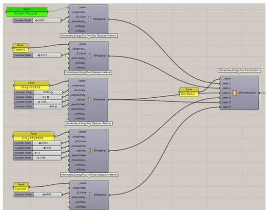 In the simulation of energy plus energy output, the wall materials were designed and selected according to the status quo, and in the simulation of daylight and radiance analysis, the reflection of interior walls, floor, and room ceilings were 50, 20, and 70, respectively. The percentages for the outer walls are 50% for the inner envelope section and 35% for the outer envelope [47]. U-values are calculated using Honeybee_EnergyPlus Construction by adding different layers of materials in each envelope according to the construction details of the case study (Figure 6).