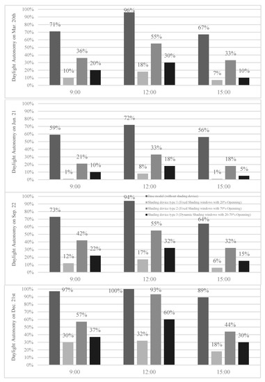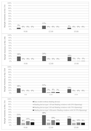 Daylight Autonomy analysis on each critical day of the year for each shading device type.
