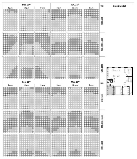 Among the criteria for measuring the dynamic daylight in office space, in this study, two main indicators, Daylight Autonomy (DA) and Useful Daylight Illuminance (UDI) were selected for analysis. DA (Daylight Autonomy) is a widely acceptable indicator for determining the frequency of light for various activities using only daylight [48]. It has been proven that the threshold for illumination in the office is 300 lux [49], and the daylight autonomy is shown as 300 DA, which means the average percentage of time in a room is above 300 lux. The initial stage of study (Figure 8) focused on four different types of windows, namely: base model (without shading device), type 1 (fixed shaded window with maximum porosity area of 70%), type 2 (fixed shaded windows with maximum porosity area of 20%), and type 3 (the dynamic shaded window with minimum and maximum openings of 20% and 70%, respectively).