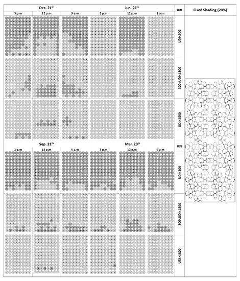 Comparative analysis of the performance of 33 options for fixed shading devices on June 21st (top) and December 21st (down).
