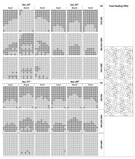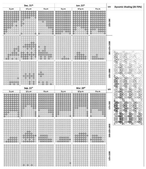 From the best options extracted from the optimization process, the following conditions for each hour of the selected date were achieved. Indeed, the results show how we can achieve the optimal daylight-related variables and consume less energy. Similarly, performing this analysis for the rest of the studied dates could guide us in setting opening rates for dynamic shading at each time of year.