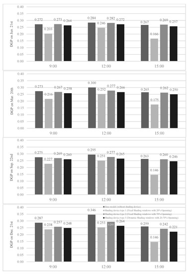 In the next step, different shading devices were analyzed for glare, inside the room. The observer stands in a room 5 m away from the window and in the middle of the room while the height of the observer is assumed to be 2 m. Evaluation is done with two criteria of daylight glare index (DGI) and daylight glare probability (DGP), illustrated in Figure 15 and Figure 16.
