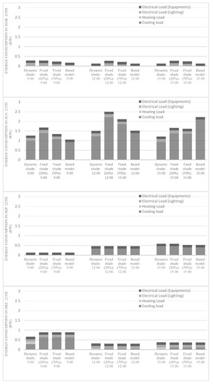 Then, the total energy consumption including heating, cooling, electric lighting, and a load of consuming equipment for the studied office room was analyzed and the results were calculated with the EnergyPlus output motor and analyzed in Excel software (Figure 17). The results show that the fixed shading device (70%) performed better than the other fixed option and, in general, the dynamic option had a better level of performance than the two other options.