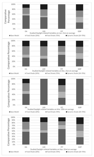 Comparing the research-dependent variables (related to visual comfort) with each other: while the base model had mostly among the highest DA and UDA, in terms of PIT (Point In Time) brightness analysis and GDP, it is a high-risk option. As far as fixed shading devices are concerned, the first one (20%) had by far the lowest DA and UDA and in GDP it had no superiority compared to the other options and, in general, the second fixed shade (70%) performed better. Finally, the dynamic option had a lower DA and UDA than the fixed shading device (70%) on most studied days (Figure 18).