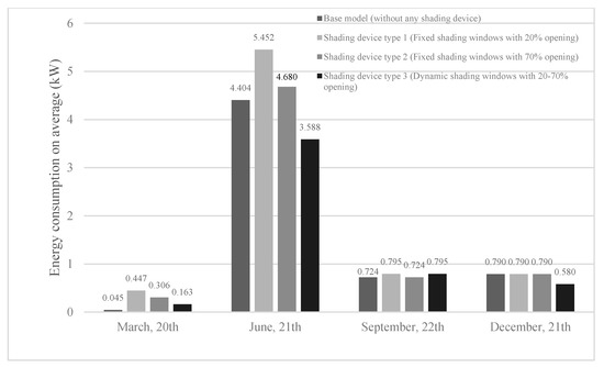 Energy consumption of the building with each shading device in studied dates and hours.