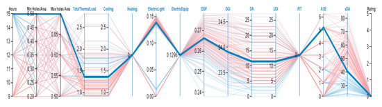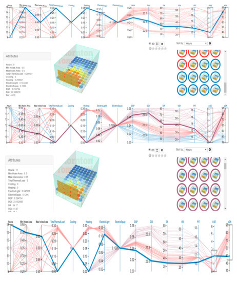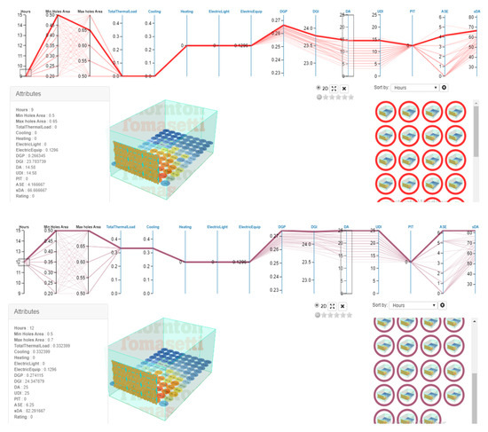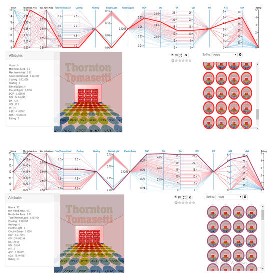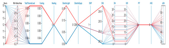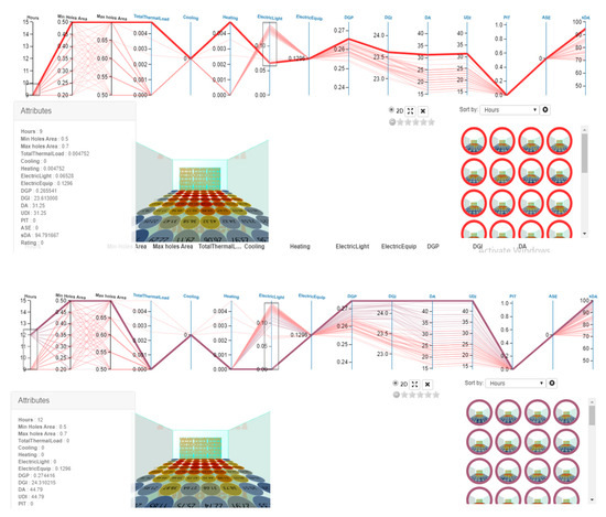 The next step is selecting the optimal condition for studied dates and hours. Due to the multivariate nature of this research, to select the best options, the Calibri plugin was used in the Grasshopper and the results were transferred to Design Explorer. The minimum area of openings was within the range of 50–20% and at intervals of 5%, and the maximum area of openings was in the range of 50–70% at intervals of 5%. A total of 105 modes were created by considering the minimum and maximum between the above values in the dynamic outer shell, which was performed for all 105 models of light and energy simulation and scoring indicators of the lead system, and the best options in the studied dates (Figure 21, Figure 22, Figure 23 and Figure 24 and Table 5, Table 6 and Table 7).
