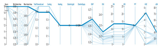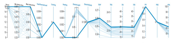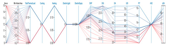 Finally, to check all possible options in increasing the reliability of the results and to find the optimal condition of the dynamic shading device at each time and each hour according to the visual comfort and energy consumption variables, a multi objectives optimization process was launched. According to the results of the study of visual comfort variables by simulation in Rhino environment, HoneyBee Plus, and Ladybug Plus, and due to the multivariate nature of this research, to select the best options, it is advised to use the Calibri plugin in Grasshopper and transfer the results to Design Explorer. The appropriate option was analyzed and the results showed the superiority and efficiency of fixed canopy with a porosity of 70% of the cavity area compared to the other cases (Figure 20).