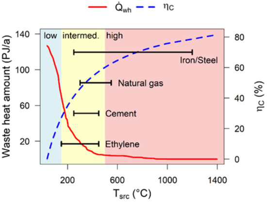 Brückner [16,17] estimated the lower limit of waste heat from exhaust gas for Germany from the emission law database. A lower reference temperature of 35 °C was assumed as a standardized value to evaluate the waste heat potential. The cumulative industrial waste heat amount of Germany is shown in Figure 1 for different temperature , Carnot efficiency and amounts of waste heat . The most relevant industry sectors for utilizing waste heat are the cement industry, ceramic industry, iron and steel industry, aluminum and copper industry, glass industry, chemical industry, gas transmission and storage, paper and pulp industry as well as the food industry. Higher temperatures offer higher efficiency and thus greater potential to utilizes the thermal energy and generate electricity. However, at higher temperatures the waste heat amount is less and that leaves only a few industry sectors. Nevertheless, a reasonable order to exploit the industrial waste heat would utilize the high temperature sources first and gradually applies the lower temperature sources.