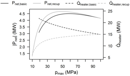 Both designs were calculated for a minimum pressure of 75 bar, a minimum temperature of 35 °C, a terminal temperature difference of 5 K, an efficiency of the turbine of 90%, an efficiency of the compressor of 85% and an efficiency of the recuperator of 90%.