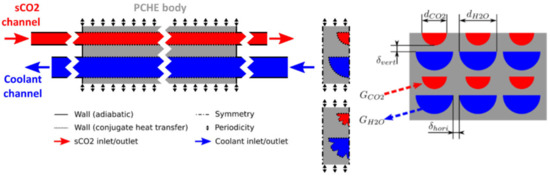 The commercial fluid dynamic code ANSYS CFX (Ansys, Inc. Canonsburg, PA, USA) was applied to simulate the pre-cooler. The geometry of the printed circuit heat exchanger consists of a semi-circular sCO2 channel, a semi-circular coolant channel and a heat exchanger body. Both channels are divided into an entrance section, a heat exchanger section and an exit section as one can see in Figure 4. The inlet temperature and pressure of the coolant channel were 35 °C and 1 bar, respectively. The entrance sections were considered to achieve a fully developed flow in the heat transfer area, in order to have comparable flow conditions. However, in a real application the fluid flows into the individual channels from a header (distributer) and may not be fully developed. The top and bottom part of the solid body uses periodic boundaries, the side of the domains were defined as symmetry and between the channels and the solid body, heat transfer conjugation was used. The solid material was assumed to be 316 L with a thermal conductivity of 16.2 W/m K. The numerical simulation was used to study the effect of channel diameter for both fluids between 0.5 mm and 1.1 mm.
