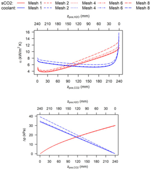 The Reynolds number of the coolant channel is approximately at 450 and thus the flow was modeled as laminar. Since the Reynolds number varies between 7000 and 14,000 for the sCO2 channel in the present study, the Shear Stress Transport (SST) model was applied for the transient and turbulent region, to calculate the turbulence kinetic energy and the turbulence frequency. Furthermore, the experimental results of Kruizenga et al. [20] as well as the pressure drop correlation of Blasius [21] and Colebrook [22] were used to validate the numerical model for two different operating conditions, which is a mass flux of 326 kg/(m2s) and 762 kg/(m2s) for a channel diameter of 1.9 mm. This comparison is shown in Figure 5 for the local heat transfer and for the pressure drop. The local heat transfer can be predicted with sufficient accuracy and the pressure drop is very well represented.