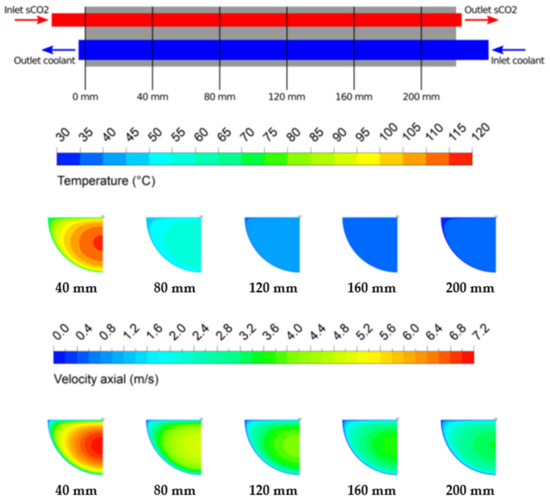 Figure 7 shows the numerical results for different axial positions along the sCO2 channel for a 0.5 mm sCO2 channel, a 0.8 mm coolant channel and a sCO2 mass flux density of 700 kg/(m2s). It can be seen, that at the 40 mm position the temperature and velocity distribution are still inhomogeneous, while from 80 mm on, both distributions become more homogeneous and nearly become equal.