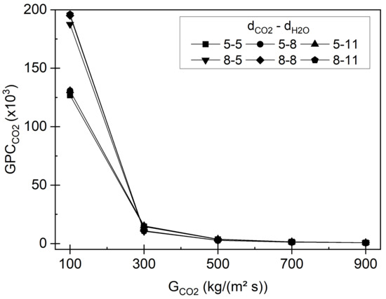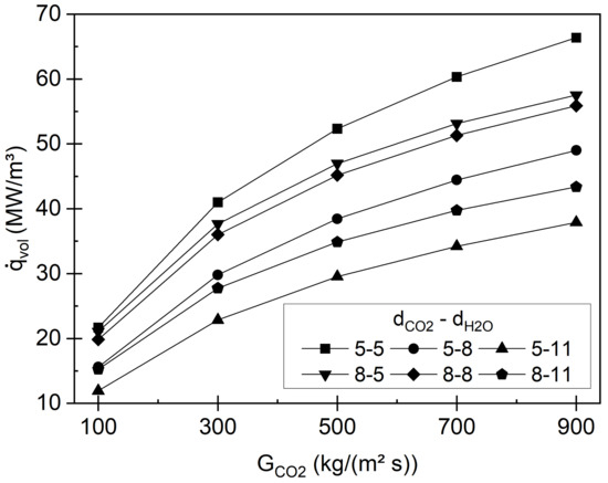 In the present investigation, the diameter of the coolant channel was changed from 0.5 mm to 0.8 mm and to 1.1 mm, and the diameter of the sCO2 channel was changed between 0.5 mm and 0.8 mm. The heat transfer results of different combinations of the channel dimensions are shown in Figure 8 for different mass fluxes. In this and the following plots, the combination of sCO2 channel to coolant channel diameter are expressed as sCO2-coolant, e.g., 5–11 represents a 0.5 mm sCO2 channel and a 1.1 mm coolant channel diameter. As expected the heat transfer increases with the mass flux, due to higher convection. Furthermore, the smallest channel diameter achieves the greatest heat transfer performance. This is, due to the high compactness of the heat exchanger as the channel diameter reduces. Furthermore, smaller channel diameter result in more heat transfer area per cross sectional area of the flow channel, which becomes clearer by considering the ratio of heat transfer area to cross sectional area of 4 L/d and consequently the heat transfer increases. It is worth to mention, that the greatest and lowest heat transfer performance occurs both for the sCO2 channel diameter of 0.5 mm for different coolant channel diameter. When the sCO2 channel diameter increases, the impact of the coolant channel diameter on the heat flux density reduces. This may be, due to the limitation of the convective heat transfer on the sCO2 channel.