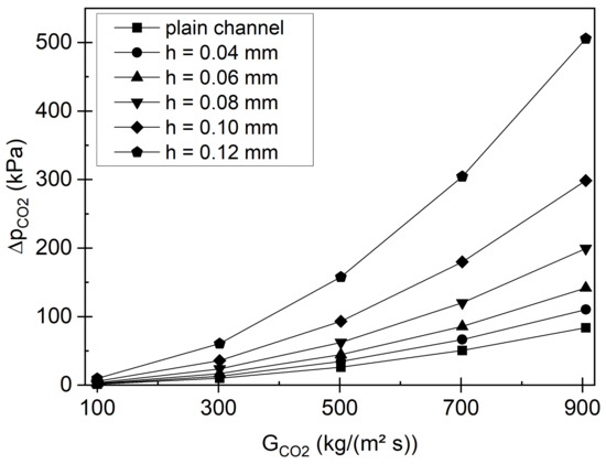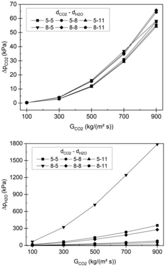 The pressure drop characteristics of both channels is shown in Figure 9 for varying mass fluxes. Similar to the heat transfer the pressure drop increases for both channels as the mass flux rises. The pressure drop of the sCO2 channel changes only little with geometry. In fact, only for the 8–5 configuration the pressure loss increases, due to a decrease of heat transfer surface area and consequently longer channel length. The pressure drop in the coolant channel increases as the channel diameter reduces. In fact, the highest pressure drop occur for the 0.5 mm channel diameter. One reason may be the reduced friction surface area at lower channel diameter. As the coolant channel diameter increases, the pressure drop strongly reduces, due to less friction surface compare to the cross-sectional area. The pressure drop of the 8–5 configuration is very high, since the required mass flux for a given heat transfer from is higher.