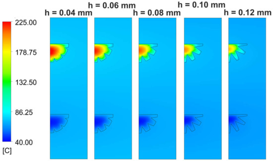 Based on this optimization an internal fin structure of the channels was investigated. For this different internal fin heights were modelled and numerical simulated by the CFD code. The fin height was varied between 0.04 mm and 0.12 mm. The heat transfer and pressure drop were calculated from the numerical results. The fin design and the temperature distribution of both channels is shown in Figure 11 for the different fins. It can be seen that the temperature differences are lower for higher fins in the shown cross section of the sCO2 channel. This is because the integrated fins penetrate the bulk sCO2 flow and heat transfer occurs more towards the center. Moreover, the temperature in the central bulk flow is lower in the sCO2 channel, since the heat transfer is greater for higher fins. Consequently, the cooling effect increases as the fin height is higher.