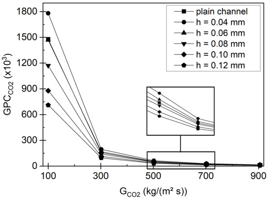 In order to determine the optimum fin configuration, the ratio of heat transfer to pressure drop will be evaluated by the global performance criterion. In Figure 14 the global performance is shown for different mass fluxes and fin heights. It can be seen that the fin height of 0.04 mm achieves the greatest global performance followed by the 0.06 mm fins. For fin heights greater than 0.06 mm the higher pressure drop, giving higher pumping power, is dominant over the heat transfer enhancement. Hence, the global performance is lower compared to the plain channel. To be more precise, the global performance increases by 25.5% for a fin height of 0.04 mm and reduces by 35.9% for the fin height of 0.12 mm compared to the plain channel at a mass flux of 500 kg/m2s. Therefore, a finned channel applying 0.4 mm fin height is recommended for the pre-cooler.