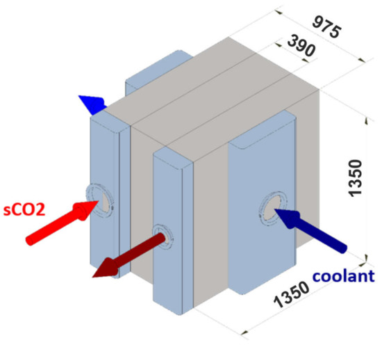 The optimized pre-cooler design of the sCO2 power cycle as well as the corresponding dimensions of the heat exchanger are shown in Figure 15 as a 3D model.