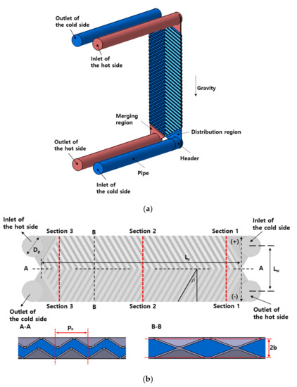3D modeling and schematics of the plate heat exchanger (PHX): (a) 3D modeling, and (b) schematics of PHX.