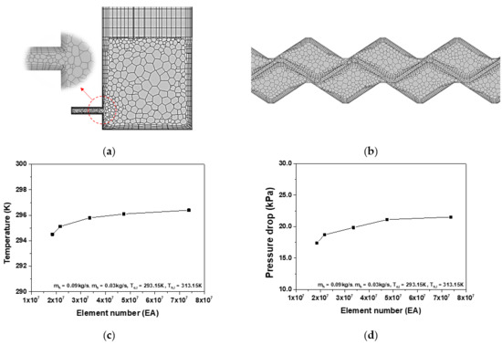 Figure 2 shows generated mesh of the plate heat exchanger and the results of the grid independence test. The area in the heat exchange between the channels on the cold and hot side was designed using a polyhedral cell, and the inlet/outlet piping was designed with a prism/hex cell. Tetrahedral cells can maintain mesh quality even in complex shapes, but they require many cells and disadvantages of numerical diffusion. Polyhedral cells can approximate the gradient better because there are multiple cells adjacent to each cell compared to tetrahedral mesh. Polyhedral cells are also more sensitive to stretching than tetrahedral. In addition, polyhedral mesh requires fewer cells than tetrahedral mesh to secure analysis accuracy; thus, it is suitable for analyzing plate heat exchangers with complex curved shapes [35]. To describe the full development region, prism cells are located near the wall, and the first grid from the wall is located at 1 < y+ < 5. The grid independence test is carried out within a grid number of 18,508,954 to 73,757,890. The outlet temperature and the pressure drop of the cold side are close to about 296.1 K and 21.1 kPa when the grid number is 47,423,034. The outlet temperature and the pressure drop of the cold side are no significant changes over the grid number of 47,423,034. Therefore, a model with a grid number of 47,423,034 is used in this study.