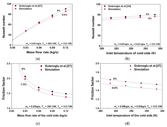 Comparison of Nusselt number according to mass flow rate and temperature: (a) Nusselt number according to the mass flow rate, (b) the Nusselt number according to the inlet temperature of the cold side; (c) friction factor according to the mass flow rate; (d) friction factor according to the inlet temperature.